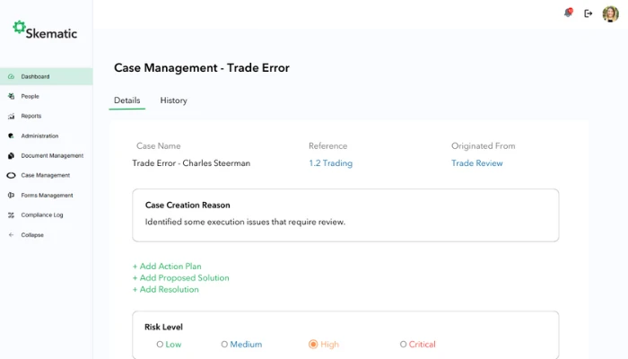 Join 200+ companies who’ve turned compliance case management from a scattered struggle into a streamlined strength. See how Skematic’s case management system is helping firms mitigate the violation risks.