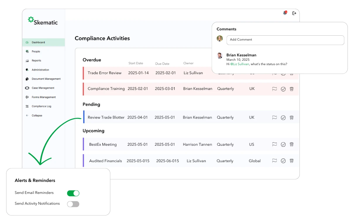 Skematic replaces manual task lists, spreadsheets, and fragmented tools with a single system designed specifically for compliance operations. Build, track, and evidence your firm’s compliance program in one auditable, automated framework — built by operators who know the job firsthand.