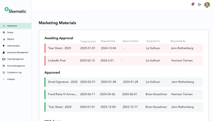 Skematic gives marketing, legal, and compliance teams one place to work together on collateral and campaign reviews. Comments, approvals, and changes are all documented as you go, so marketing can move quickly while you can ensure compliance. The platform helps spot potential issues early in the process, reducing review cycles. Plus, you’ll have clear evidence of your review process ready for regulators, showing how your team evaluates and approves marketing materials.