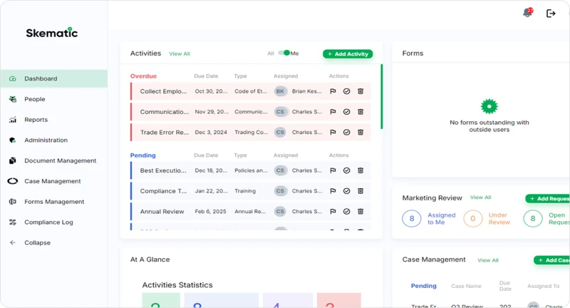 Skematic understands the unique risks and challenges faced by SEC-registered investment advisers. From maintaining regulatory obligations to documenting fiduciary responsibilities, our platform transforms manual compliance processes into streamlined digital workflows that help you meet your regulatory requirements.